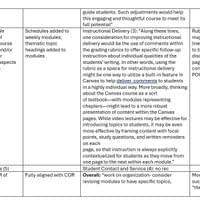 kaufman to add a tab for “assignments” in the left-hand Canvas menu, and prune unused tabs to improve navigation." Adjustments made on Canvas.4. Student contact and service (rating 5): Prior evaluation included the following: "To be even more thorough in the syllabus, it could include the specific timeframes for issuing feedback, as well as information about communication response times (e.g., how long it takes to reply to student emails, what days the instructor is and is not available by email, assuming this availability differs from the office hours). Adjustment