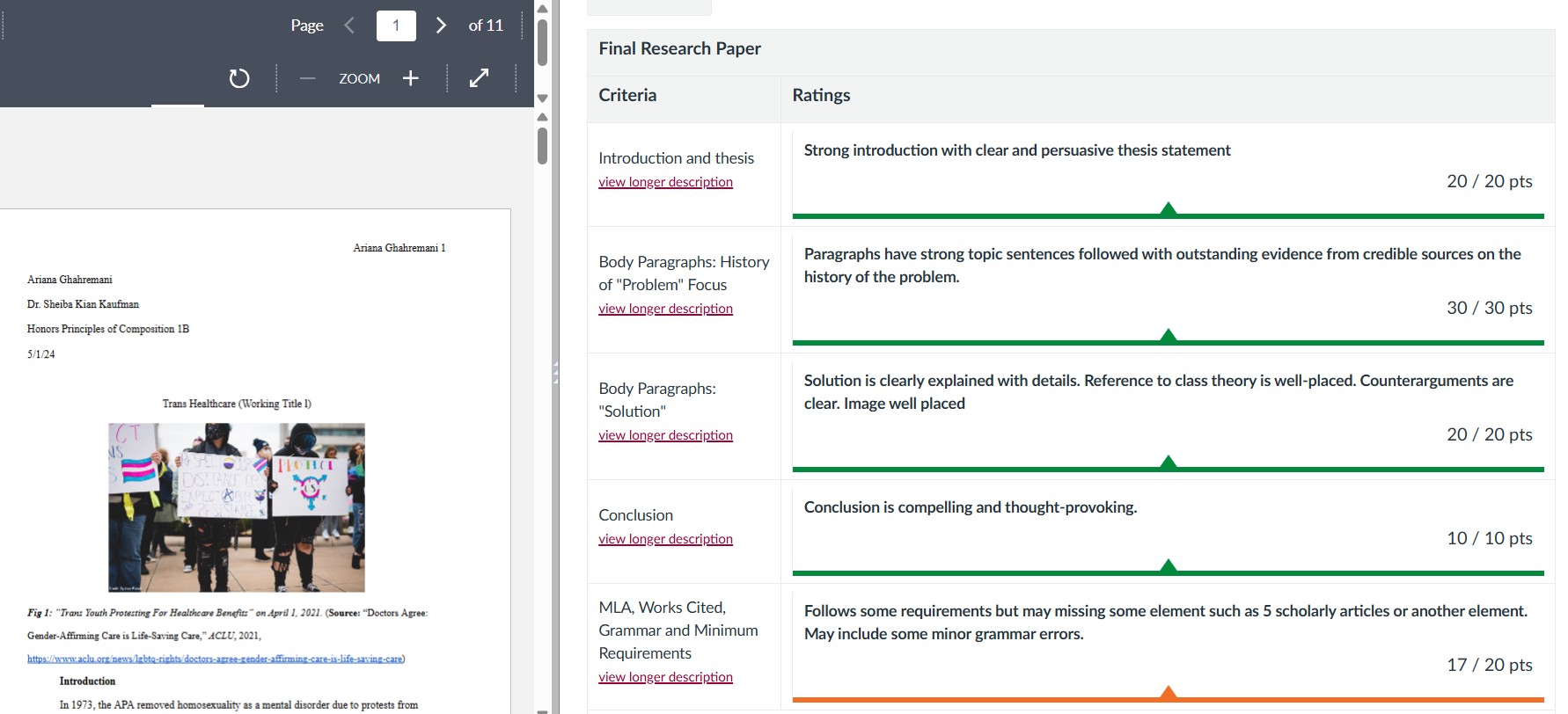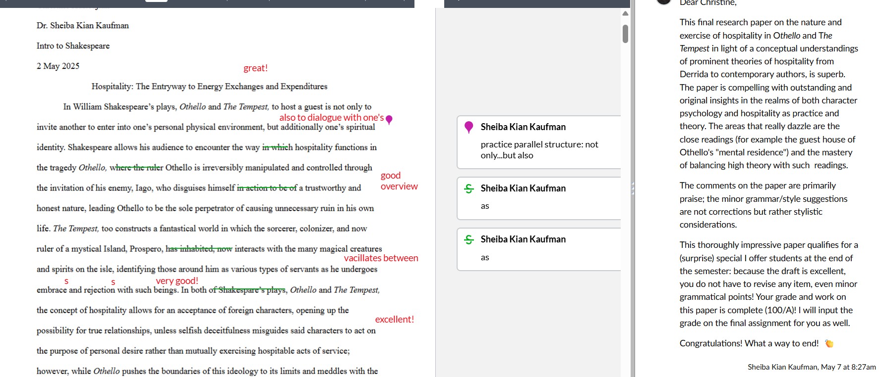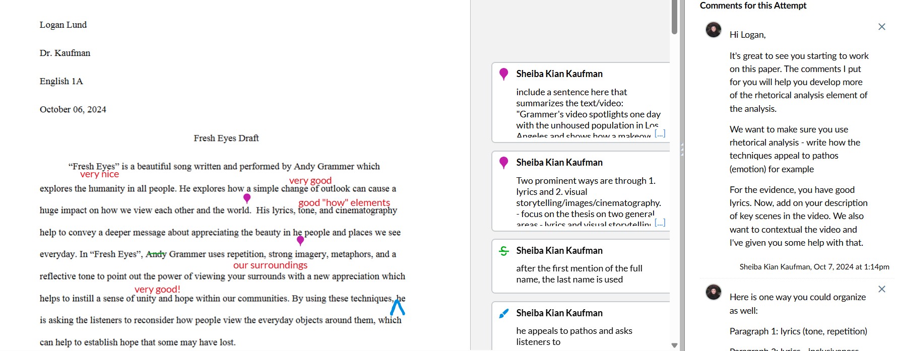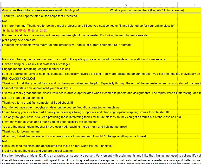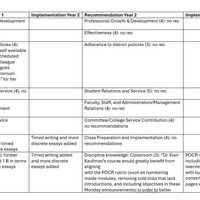 made to include these timeframes on syllabus for English 24.5. Instructional Delivery (rating 4): Prior evaluation advised the following: "We know Professor Kian Kaufman is authentically passionate about the subject and desire for that passion to be conveyed throughout the course, either in her lectures, updates, or other materials provided". Adjustment made through creation of new video lectures that capture passion more effectively to be shared during observation with TRC.